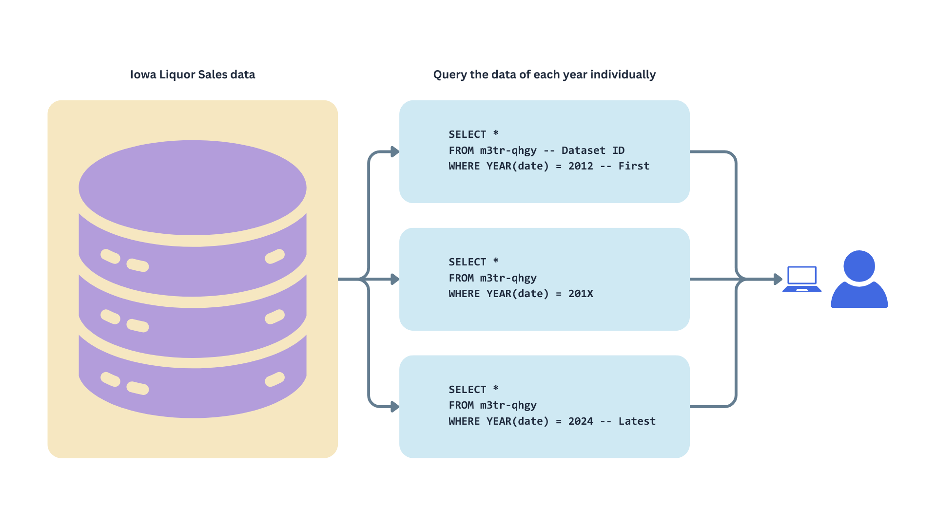 Let’s say we work for a big chain of liquor stores located in the US, Iowa. Part of the intelligence in your company is built upon the information made available through SODA API, and it feeds some of the dashboards the decision-makers consume. You also use it often to do research and predictive modeling. Some stakeholders have started complaining about the loading times of the dashboards, and you have also been a little frustrated with the time it takes to get the data to train your predictive models.